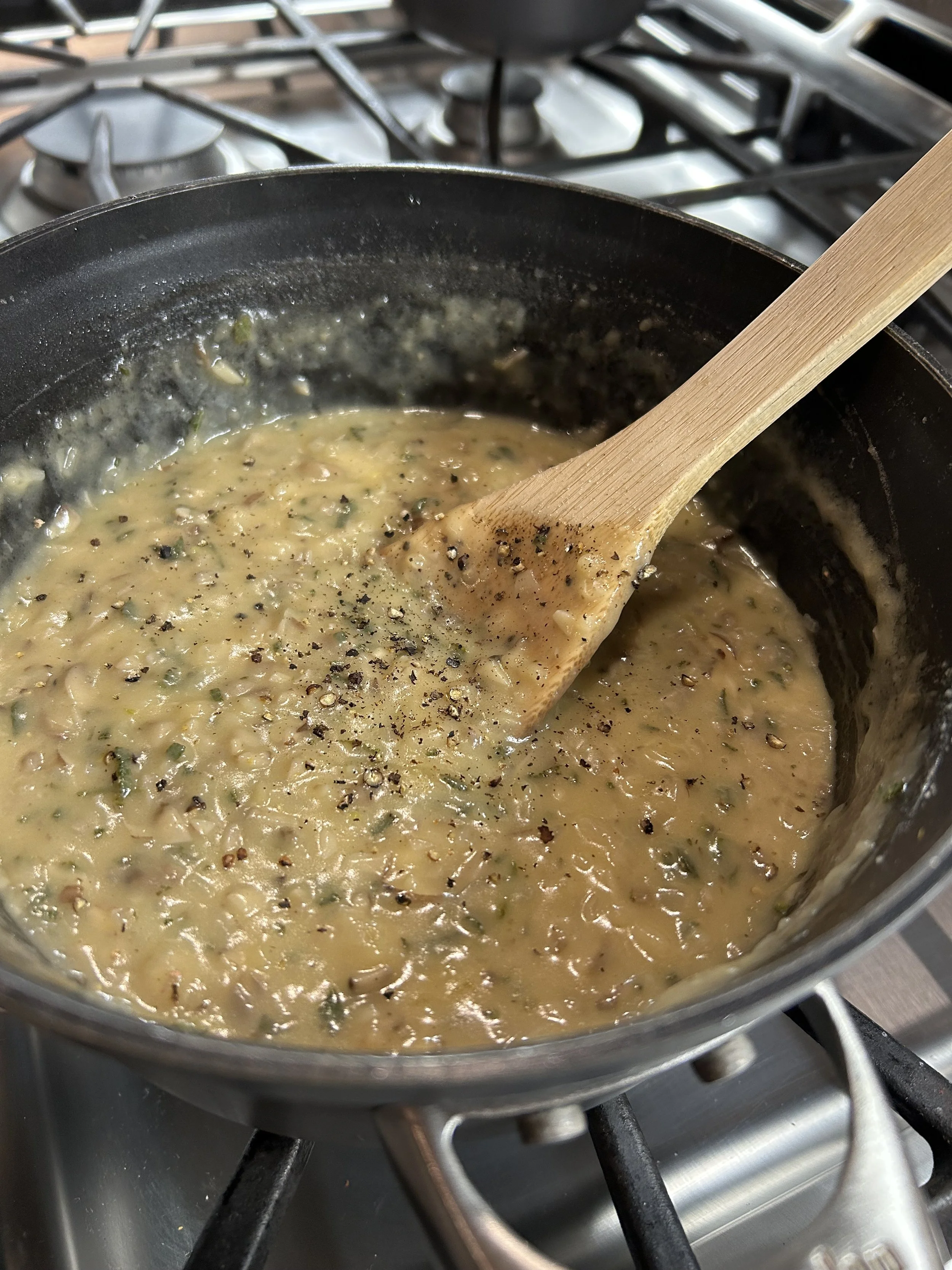 Add more salt and pepper as desired. If your gravy is looking thicc- you can always add more wine to thin.